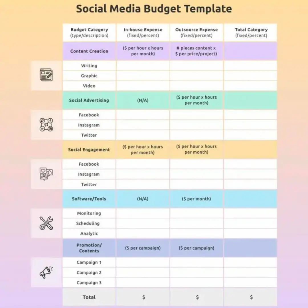 Empower your budget strategy with our Social Media Budget Template. Plan a precise budget that tracks, analyzes, and manages expenses. Simplify your budget process, monitor your progress, and adjust for optimal results.