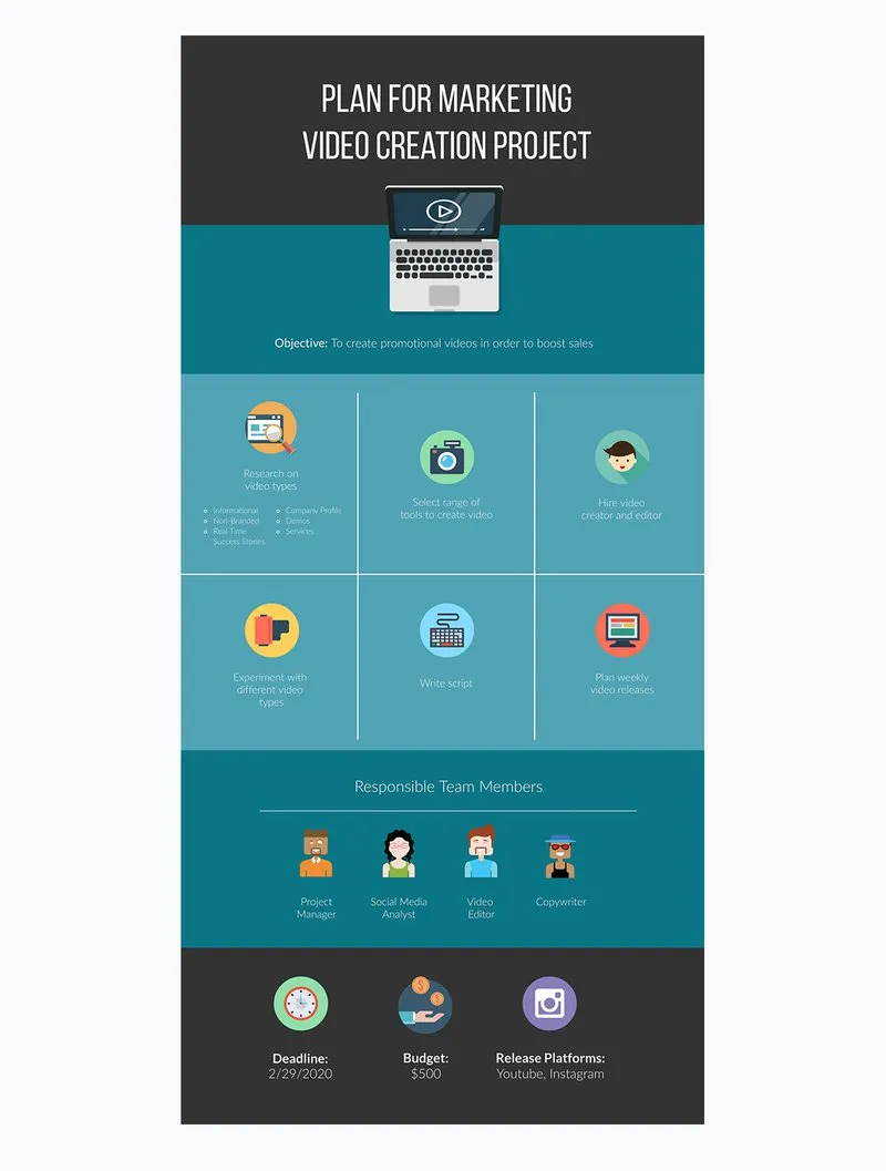 Creating a video strategy for a brand can be a pretty complex task. You have a bunch of teams, a variety of factors to consider, and it can become a big mess pretty quickly. So, if you want to create a strategic marketing plan template for a specific project like that, then use this infographic template from Visme to display everything and make it all really easy for the whole team to follow.