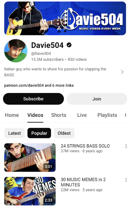 Davie504’s channel strikes a harmonious balance between the eccentric and the extraordinary. Known for blending memes with masterful bass guitar solos and challenges, Davie has cemented his place as a colossal figure in the independent music scene on YouTube, boasting an impressive following of over 13 million subscribers.